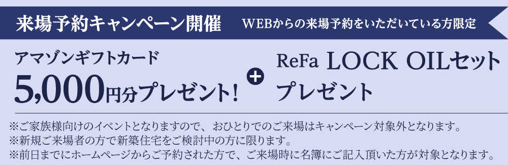 | 期間 | 開催中 2025/11/04~2025/11/28 | 備考 | ◎完全予約制・お1組様ごとのご案内 ◎平日営業日のみ開催 -------- ◎前日までに予約・ご来場の方にご来場プレゼント! ※新規ご来場のご家族様限定。予約単位で進呈となりますので、複数家族でまとめて予約された場合はお一組のご家族様のみにご進呈となります。 ※アンケートにお答えくださった方が対象になります。 ※マイホームをご検討中の方に限ります。 |