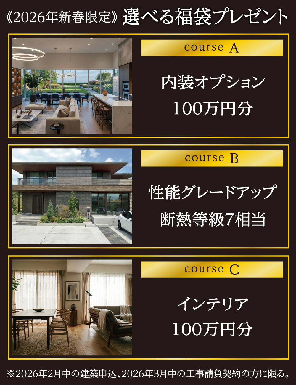 | 期間 | 開催前 2026/01/17~2026/01/25 | 備考 | ◎完全予約制・お1組様ごとのご案内 ◎平日も見学予約できます。 -------- ◎前日までに予約・ご来場の方にご来場プレゼント! ※新規ご来場のご家族様限定。予約単位で進呈となりますので、複数家族でまとめて予約された場合はお一組のご家族様のみにご進呈となります。 ※アンケートにお答えくださった方が対象になります。 ※マイホームをご検討中の方に限ります。 選べる福袋プレゼント ・内装オプション 100万円分 ・性能グレードアップ 断熱等級7相当 ・インテリア 100万円分 ※2026年2月中の建築申込、2026年3月中の工事請負契約の方に限ります。 |