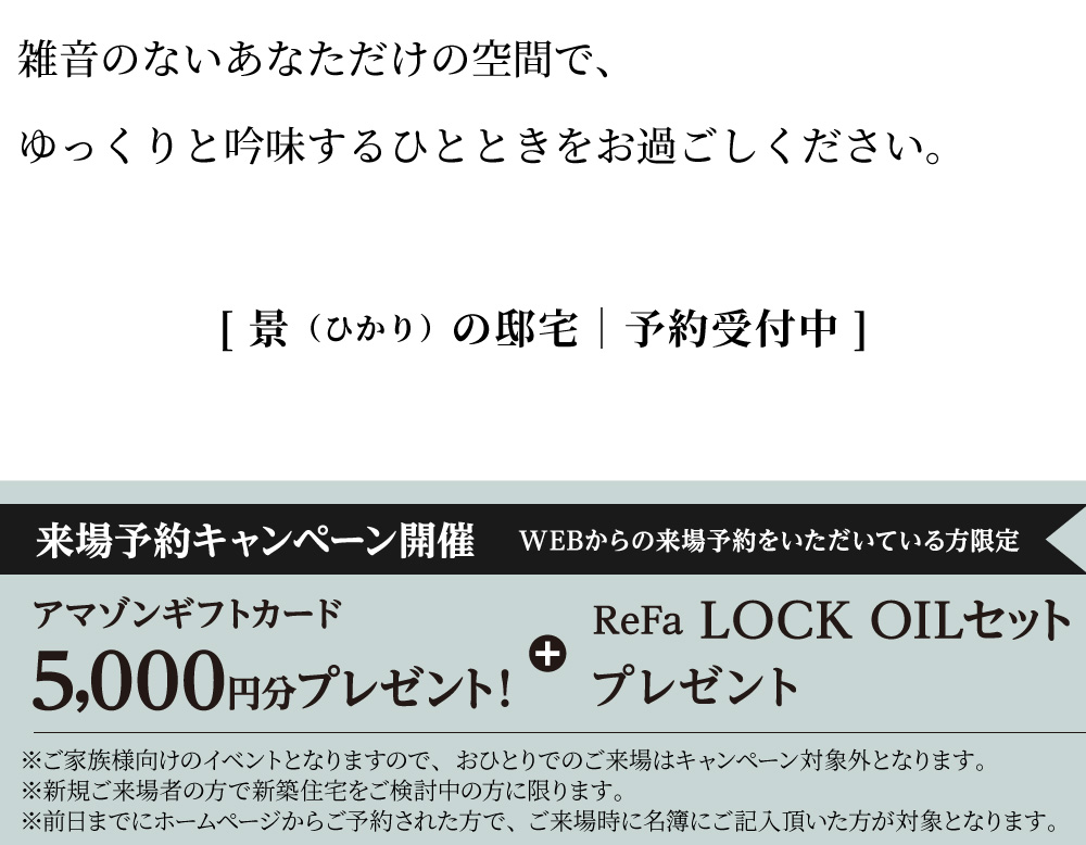 | 期間 | 開催直前 2026/03/14~2026/03/22 | 備考 | ◎完全予約制・お1組様ごとのご案内 ◎平日も見学予約できます。 -------- ◎前日までに予約・ご来場の方にご来場プレゼント! ※新規ご来場のご家族様限定。予約単位で進呈となりますので、複数家族でまとめて予約された場合はお一組のご家族様のみにご進呈となります。 ※アンケートにお答えくださった方が対象になります。 ※マイホームをご検討中の方に限ります。 |